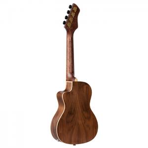 RUWN-CE, modèle Concert pan coupé, EQ Ortega MagusUke, table noyer, fond & éclisses noyer, manche okoumé, sillet 35 mm, diapason 376 mm, binding érable, touche & chevalet tecwood, tête inversée, mécaniques en ligne dorées à bain d'huile, cordes Ortega, avec housse deluxe.