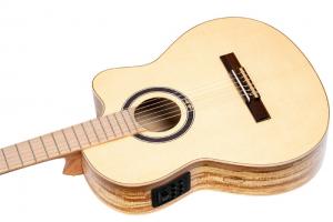TZSM3, modèle signature Thomas Zwijsen, modèle Slim Neck, pan coupé, EQ Ortega/Fishman Clasica Blend (sortie jack/XLR et accordeur intégré), table épicéa du Canada massif, fond et éclisses érable échauffé satiné, manche acajou satiné, sillet 48 mm, binding érable sur support noyer, touche érable, radius 12", chevalet 6 trous pau ferro, truss rod double action, avec soft case signature Thomas Zwijsen.