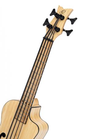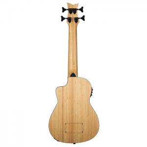 RUNAB-UB, modèle Ukebass, short scale, pan coupé, EQ Ortega MagusUkePro (accordeur intégré), table, fond & éclisses bambou massif, manche bambou, sillet 45 mm, diapason 530 mm, touche & chevalet bambou, 1 ouïe en F avec binding ABS noir, binding ABS noir, mécaniques noires avec boutons noirs, avec housse luxe.