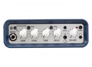 Ampli guitare MINI-STB-LI2 stéréo 2x 3W, connexion Bluetooth, look Lionheart, 2x HP 3", 2 canaux, Gain, Drive, Level, Tone, Delay, entrée auxiliaire, connectique LSI (Laney Smartphone Insert) avec câble inclus, alimentation sur 6 piles AA (non fournies) ou par adaptateur secteur optionnel, enceinte plastique haute qualité résistante aux chocs, dimensions: 20.5 x 14.2 x 10 cm, poids: 1.8 kg.