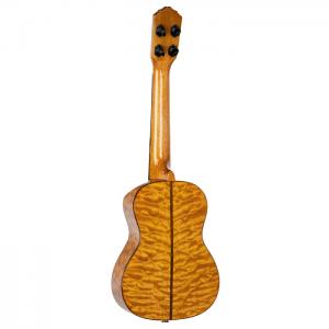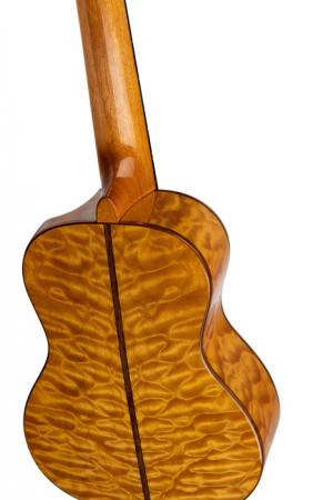 RUET-QMA, série Elite, modèle Concert pan coupé ergonomique, EQ Ortega MagusFly avec contrôles volume, phase et tone dans la rosace, table érable pommelé massif, fond & éclisses érable pommelé, manche acajou, sillet 36 mm, diapason 380 mm, binding acajou/érable, touche & chevalet noyer, incrustations touche abalone style"tree of life", rosace abalone, mécaniques Graph Tech noires avec boutons noirs, attache courroie sur sortie jack, avec housse Elite.