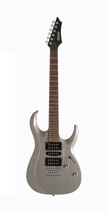X200, corps peuplier, manche vissé érable, touche jatoba, 24 frettes, radius 15.75", diapason 25.5", trémolo 2 points, Micros Cort Powersound (H-S-H), 1 volume, 1 tonalité, sélecteur 5 positions, mécaniques à bain d'huile, accastillage chromé, tirant .009" -.42", finition gris brillant