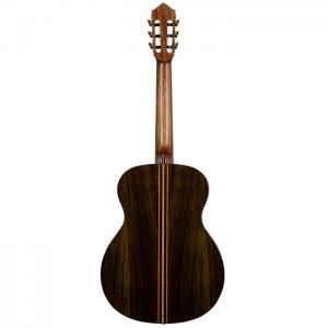 GRANDSUITE, modèle Slim Neck, table épicéa massif, fond & éclisses palissandre avec bandes en érable flammé, purfling nacré, manche okoumé (sillet 48 mm), touche & chevalet palissandre, chevalet 12 trous, truss rod double action, mécaniques laiton/noir satiné classe A, armrest, évent sur éclisse, cordes Ortega NYP44H, avec housse deluxe rembourrée.