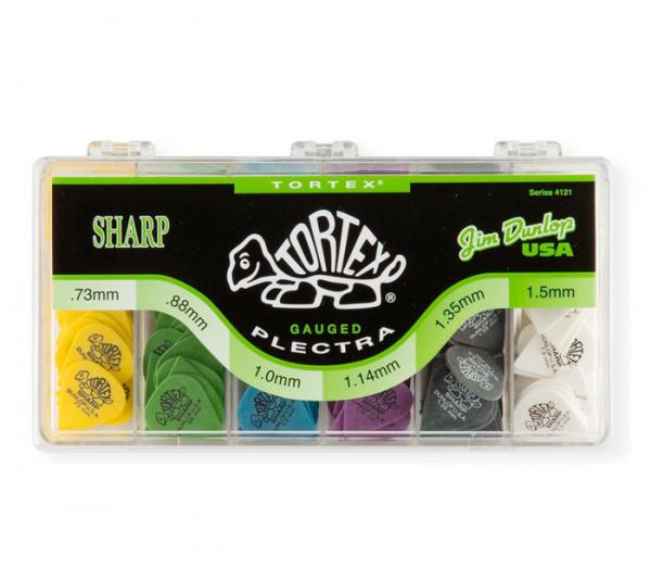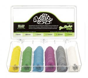 Boîte de 216 médiators Tortex Sharp, 36 de chaque en 0.73, 0.88, 1.0, 1.14, 1.35 et 1.50 mm