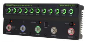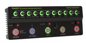 Pédalier d'effets et préampli TRANSIT-A pour guitare acoustique, commandes rétroéclairées, accordeur chromatique intégré, bouton Piezo pour augmenter l'impédance d'entrée, switch boost personnalisable, chorus à un bouton, delay avec contrôle de niveau, feedback et Tap Tempo, switch Pre-shape pour courbe EQ classique Trace Acoustic, reverb, switch d'inversion de phase, EQ actif 3 bandes, filtre Notch, contrôles de Gain d'entrée et de niveau de sortie, sorties stéréo et dry, sorties XLR Pre/Post équilibrées avec Ground Lift, entrée auxiliaire, sortie casque, dimensions (pédale seule) : 31,2 × 11,4 × 5,8 cm, poids : 1,18 kg.
