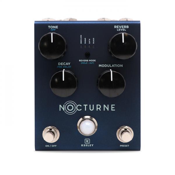 Pédale NOCTURNE, reverb stéréo développée avec Andy Timmons, 3 modes (Nocturne, Spring, Plate), contrôle de pré-delay permettant aussi des effets de slapback, 4 réglages (Tone, Level, Decay, Modulation), stockage de presets, bypass au choix True ou Buffered, compatibilité Expression et MIDI avec jusqu'à 72 emplacements, trails On/Off, indicateur LED (bleu = réglages en direct, rouge = preset activé), boîtier métal, dimensions : 124.5 x 99 x 66 mm, poids 450 g, alimentation 9V-18V sur bloc secteur non fourni, consommation 150mA.