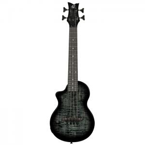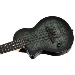 NEO-BS-TGB, modèle Ukebass gaucher, pan coupé, EQ MagusExpress, table érable flammé, corps okoumé, manche érable, housse, gris