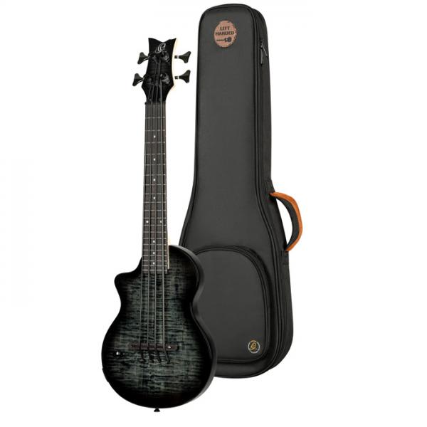 NEO-BS-TGB modèle Ukebass gaucher, pan coupé, EQ Ortega MagusExpress rechargeable, table érable flammé, corps okoumé, manche érable, sillet 45 mm, diapason 512 mm, touche & chevalet amarante, mécaniques noires à bain d'huile, avec housse.