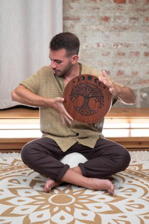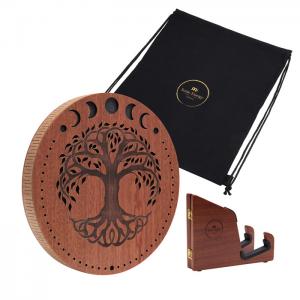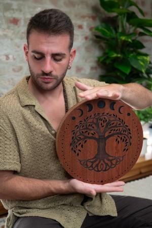 Surface sculptée motifs phases lunaires et arbre de vie.