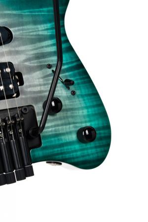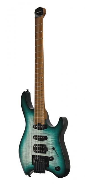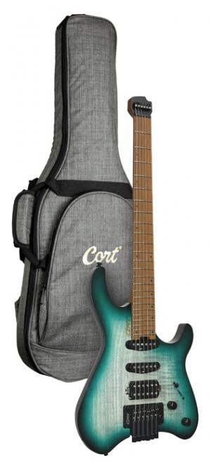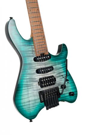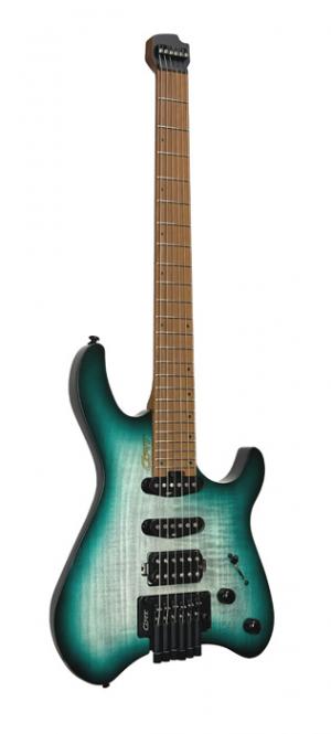 SPACE G6TR, headless, corps okoumé avec placage érable flammé, manche 5 pièces, micros Cort VTS 63 & VTH77, lagoon, housse