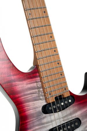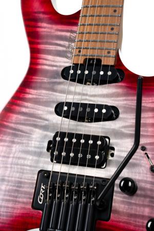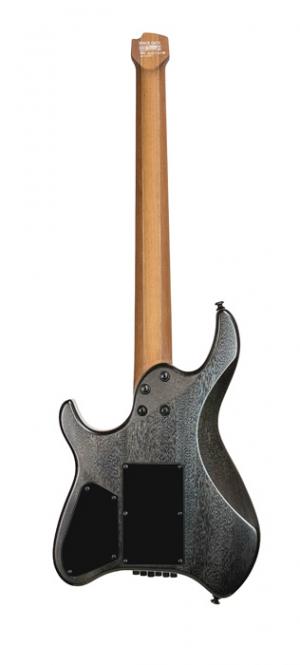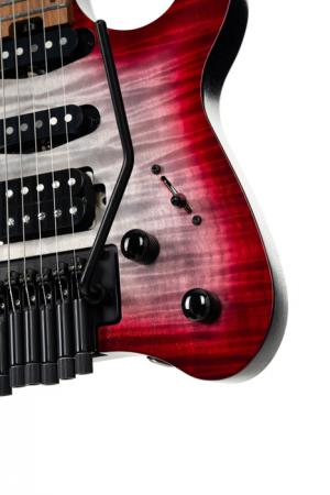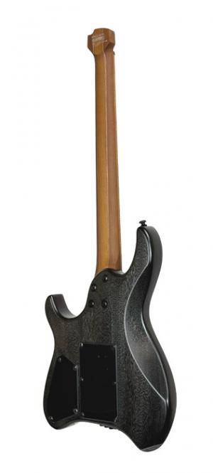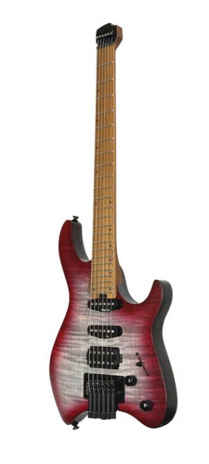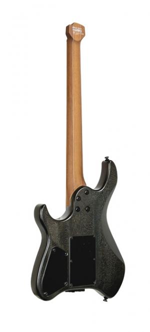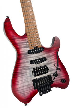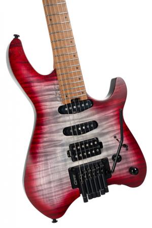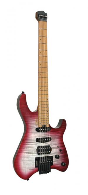 SPACE G6TR, nouvelle forme"space" headless, corps okoumé avec placage érable flammé, manche 5 pièces érable torréfié & noyer, touche érable torréfié, 24 frettes, vibrato, 1 micro double Cort Voiced Tone VTH77 et 2 micros simples VTS63, 1 volume, 1 tonalité, sélecteur 5 positions, logo nouvelle génération, repères phosphorescents, accastillage noir, sillet PPS, cordes D'addario EXL110, avec housse.
