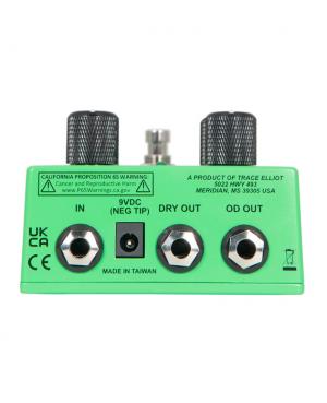 Pédale d'overdrive pour basse, circuit à clipping asymétrique doux pour une saturation vintage de type lampe, contrôle de tonalité conçu pour compléter parfaitement les circuits Pre-Shape des amplis Elf, TE-1200 et des modèles Trace Elliot classiques, contrôle Blend intégré pour ajuster le mélange entre le signal saturé et le signal clair à la sortie principale, sortie Dry indépendante pour envoyer le signal non traité vers un processeur ou une autre chaîne d'effets, fonctionnement en true bypass pour préserver le signal original, alimentation interne bipolaire 18V à partir d'un adaptateur standard 9VDC ou d'une pile 9V pour une dynamique étendue sans saturation.