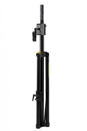 Support enceinte avec adaptateur EZ, manivelle repliable, pied réglable pour sol irrégulier, niveau à bulle intégré, échelle de hauteur sur le tube, structure en acier robuste, conception en 3 parties pour un rangement compact et une grande stabilité à hauteur maximale, pour enceintes dont le diamètre de la bride est compris entre 35 et 40 mm (hauteur : 127 - 223 cm, poids : 4,9 kg, charge supportée : 50 kg).