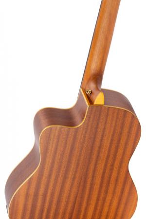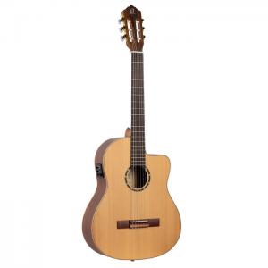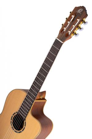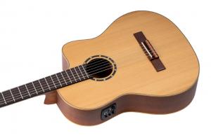 RCE131SN, modèle Slim Neck, pan coupé, EQ Ortega MagusPro (accordeur intégré), table cèdre rouge canadien massif, fond & éclisses acajou, manche acajou (sillet 48 mm), touche (plate) & chevalet sonokeling, chevalet 12 trous, truss rod double action, cordes D'Addario, avec housse rembourrée.
